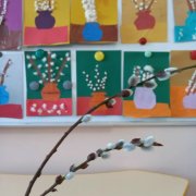 Наши дети группы «Знайка» сделали вот такую аппликацию "Веточки вербы" , но не совсем обычную, а в нетрадиционной технике, с использованием ваты. Мы внимательно рассмотрели живую веточку, стоящую у нас в вазе, осторожно потрогали её пушистые почки, которы